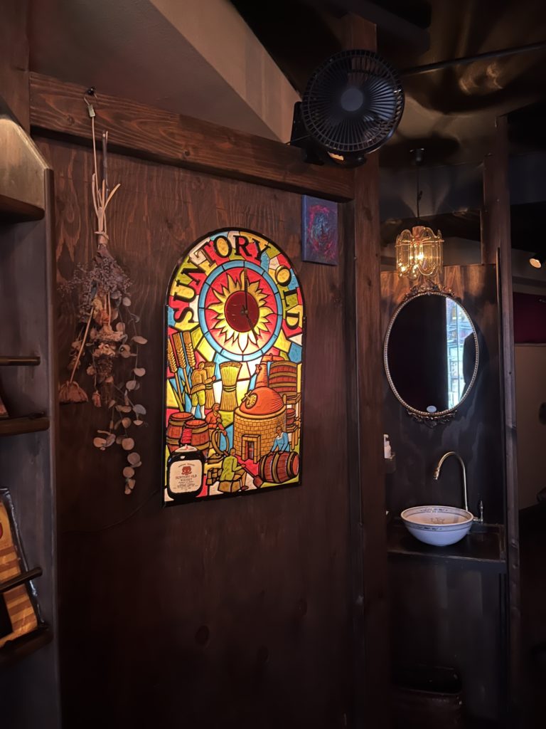 レコードが静かに流れるレトロな空間。温かいライトやステンドグラスの光が美しいお店です。